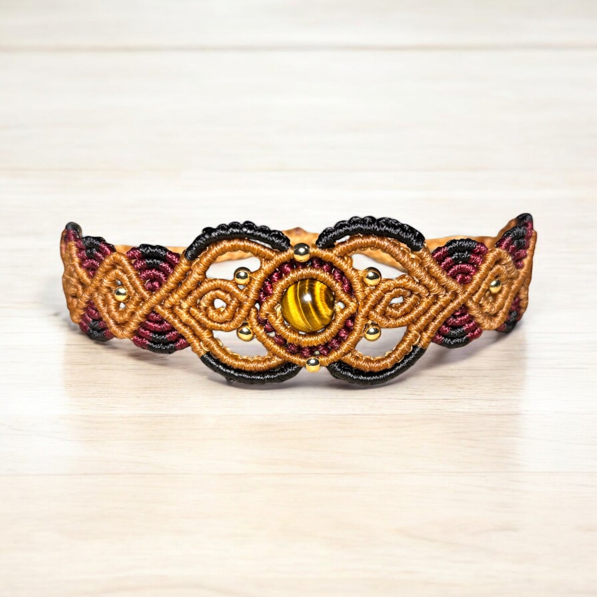 Handcrafted with warm golden, burgundy, and black threads, this macrame bracelet features a striking tiger’s eye gemstone at its center. Detailed knotwork and metallic accents give it a bold boho vibe that radiates confidence and balance.