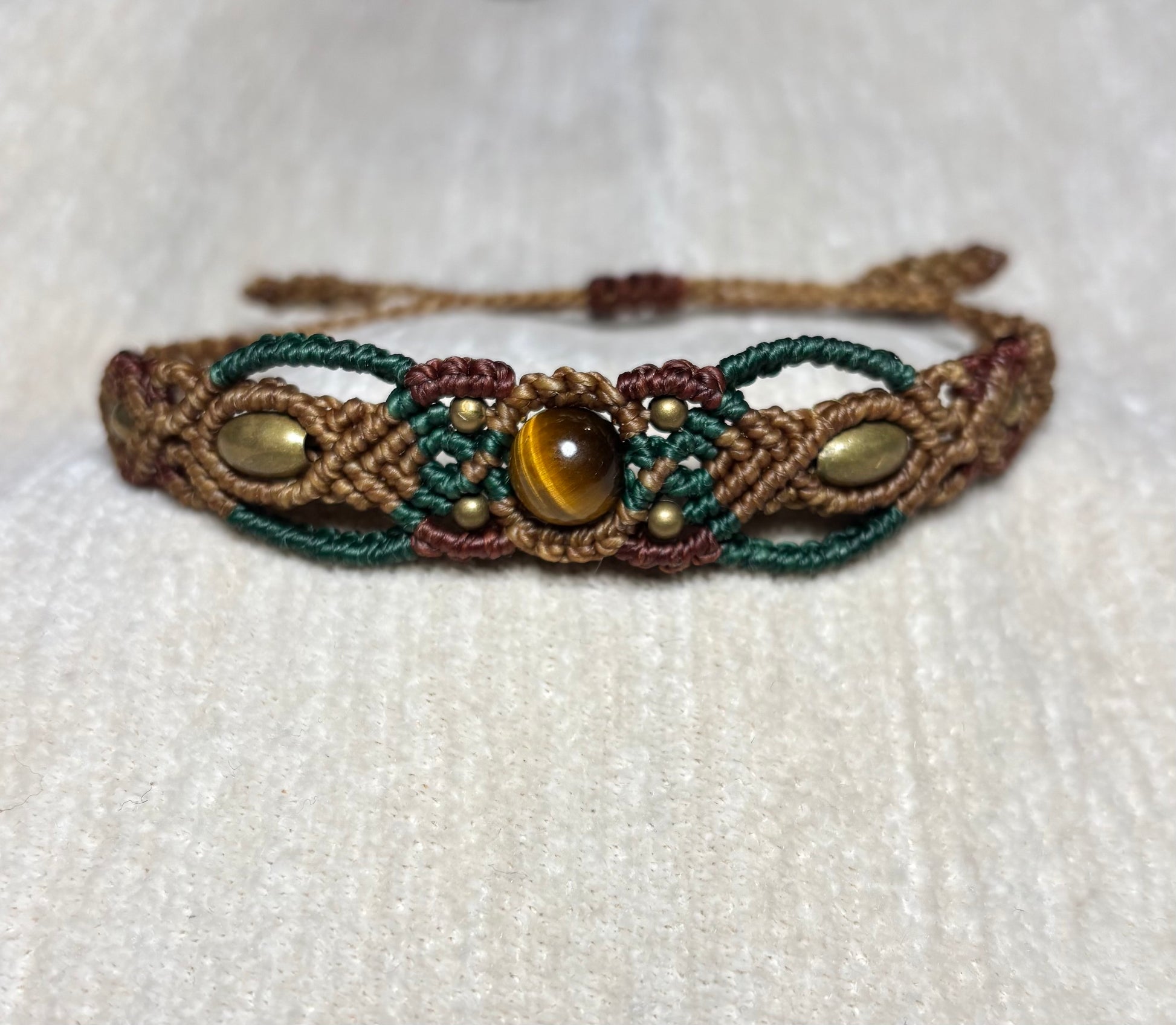 This handmade macrame bracelet features a polished Tiger’s Eye stone at the center, surrounded by earthy tones of tan, green, and rust. Each piece is hand-knotted with care, accented with brass beads for a warm, natural finish.